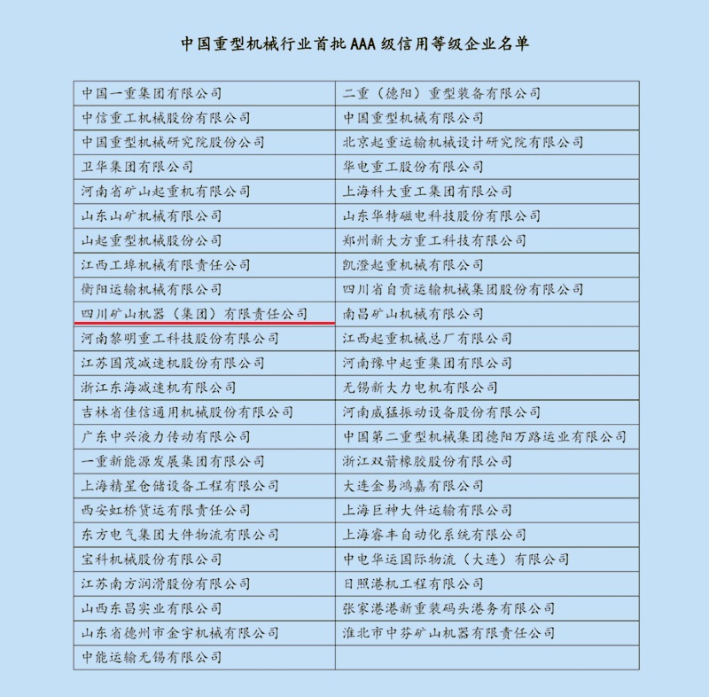 以下為中國重型機(jī)械行業(yè)首批AAA級信用等級企業(yè)名單: