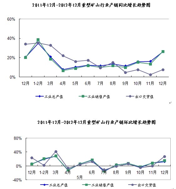 2012年1-12月份,全國重型礦山機械行業(yè)的發(fā)展形勢有所回升,工業(yè)總產(chǎn)值和銷售產(chǎn)值同比增速明顯上升,環(huán)比增速平緩,出口交貨值同、環(huán)比增速均有所回升。