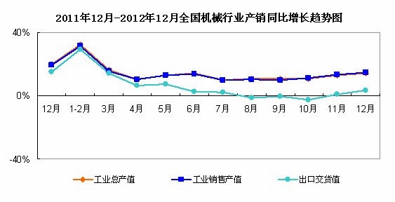 統(tǒng)計數(shù)據(jù)顯示,2012年1-12月,全國機械工業(yè)經(jīng)濟運行速度同比持續(xù)呈現(xiàn)回升的態(tài)勢。12月份,工業(yè)總產(chǎn)值的累計同比增速為14.24%;工業(yè)銷售產(chǎn)值的累計同比增速為14.64%,出口交貨值的累計同比增速為3.26%。